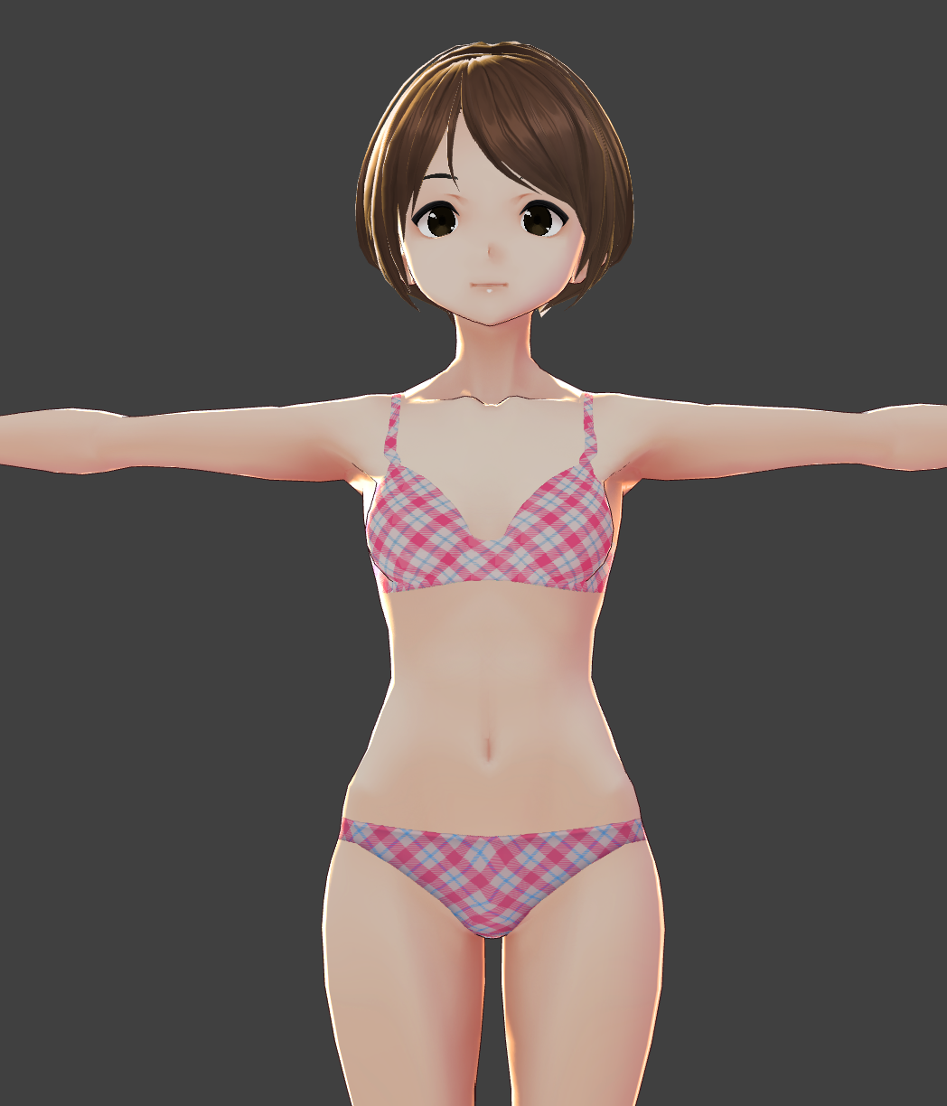 では,βの肌テクスチャと下着のテクスチャをモバイルに適用してみます。 まず,β生まれの元子の体型テクスチャをテクスチャ交換スクリプトで取り出し, テクスチャ合成スクリプトで下着テクスチャ, 今回はRingoがBOOTHで無料配布してしまった黒歴史 VRoid studio β 青春フォトグラフィーコーデ下着テクスチャ(非公式) を着せてみました。 右図の様に概ね問題ないように思われます。