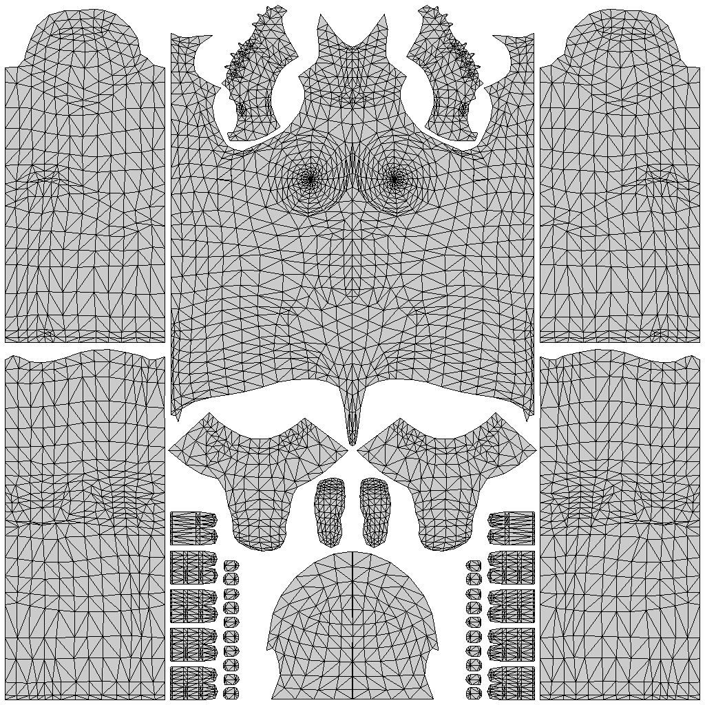 細部を見てみます。写真は正式版のテクスチャをモバイルに使った場合です。 上半身では,正式版はモバイルよりも肩や脇の横幅が広がっています。 正式版のテクスチャをモバイルで使った場合,肩紐がズレるのはこのためです。 また,正式版の胴体部分は全体に幅が広がっているので, モバイルのテクスチャを正式版で使うと背中に隙間ができます。 肩の背中側はモバイルの方が上にありますので, 正式版のテクスチャをモバイルで使うと左図の様に肩に穴ができてしまいます。